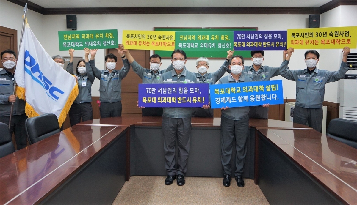 Chung Dae-sung, the CEO of Daehan Shipbuilding, and his employees participated in a relay campaign praying Mokpo University to attract premedical course at the conference room of Daehan Shipbuilding in Haenam-gun.