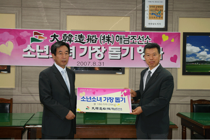 대주그룹 계열 대한조선 김호충 사장은 지난 8월 31일 해남군청에서 정화균 해남 부군수에게 소년소녀 가장 돕기에 사용할 사랑의 쌀 186가마를 전달했다. 이 행사는 지난 8월 21일 대한조선 용골거치식 행사에 초청된 협력업체들에게 기념화환 대신 사랑의 쌀을 구입해 주도록 한 대한조선측의 제안이 받아들여짐에 따라 이루어지게 되었다. 이날 전달된 쌀은 20kg 해남미 186가마(690만원 상당)로 경제적 지원이 필요한 소년소녀 가장들에게 전달될 예정이다. 특히 이번 행사는 지역에서 생산되는 쌀 나누기 행사를 통해 어려운 현실에 직면해 있는 지역사회를 도와 쌀 소비를 촉진시키는 계기를 마련한다는 의미도 담고 있어 그 뜻을 더한다. 대한조선 관계자는 “용골거치식 행사를 기획하면서 한번 쓰고 버려지는 기념화환 대신에 지역 소외 계층을 돕기 위해 사랑의 쌀을 기증받았다”며 “진수식을 비롯하여 향후 계획 중인 기념식 때도 이 같은 행사를 실시하여 지역사회에 봉사할 계획이다”고 밝혔다. 한편 대한조선은 지난 8월 21일 해남조선소 제 1 도크에서 용골거치식(Keel Laying) 행사를 갖고 본격 가동에 들어간 상태다. 대한조선은 용골거치식 행사 때도 화원면 지역민을 초청하여 기념품을 증정하고 음식을 대접 하는 등 제 1호선 블록 안치의 기쁨을 함께 나누기도 했다.
