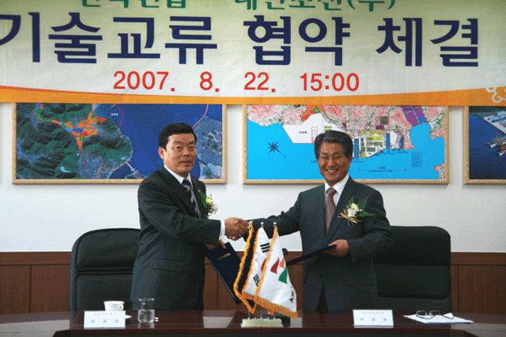 대한조선과 한국선급은 지난 22일 대한조선㈜ 해남조선소 대회의실에서 양사 관계자들이 참석한 가운데 상호 기술교류를 위한 협정을 체결했다. 이번 협정체결을 계기로 양 사는 앞으로 선박의 설계 및 건조에 관계되는 조선해양기술 및 차세대 설계ㆍ생산기술 분야의 공동 연구와 영업 정보의 상호 교류 등을 통해 해양산업발전을 위한 상호 협력체계 구축 및 국제 경쟁력을 강화할 수 있는 발판을 마련하게 됐다. 이번 기술교류 협약을 체결한 대한조선은 2005년 하반기 조선소 건립공사에 들어간 지 20개월여 만인 지난 21일 제 1 도크에서 170K BC 1호선에 대한 용골거치식을 갖고 본격 가동에 들어간 상태다. 또한 대한조선은 지난 7월 18일 2,083천㎡(63만평)부지를 조선소 전문산업단지로 지정 받고 곧 제 2, 3도크 건설에 돌입할 예정이다. 한편 대한조선과 손잡게 된 한국선급은 그 동안 공통구조규칙(CSR) 프로그램을 개발하여 각 조선소에 기술지원을 해왔다. 한국선급은 2008년 국제선급연합회의 의장업무 수행을 계기로 해운ㆍ조선산업과의 연계를 강화하여 기술 서비스를 확대할 방침이다. 이날 한국선급 오공균 회장은 “이번 협정체결을 계기로 한국선급이 47년의 역사를 통해 쌓아온 선박 및 해양 기술을 바탕으로 현재 세계적으로 성장하고 있는 대한조선에 모든 기술적 지원을 아끼지 않을 것”이며, “한국선급의 브랜드 가치를 높이기 위해 대한조선의 해외영업에도 적극 동참하겠다”고 밝혔다. 한편 대한조선 박재영 부회장은 “대한조선은 해남군 화원면 일대에 세계 최대의 조선산업단지 건설을 목표로 하고 있다”며, “지난 21일 제 1 도크의 역사적인 가동을 알리는 1호선의 Keel-Laying을 거점으로 세계 제일 조선소로 발전하기 위한 노력을 다하겠다”며 자신감을 내비쳤다. 한국선급은? 한국선급은 선급업무를 행하는 선급단체로서, 해상에서 인명 및 재산의 안전을 도모하고 조선ㆍ해운 및 해양에 관한 기술진흥을 목적으로 하는 비영리 법인이다. 주요활동으로 선박검사ㆍ연구개발 ㆍ 품질인증업무 ㆍ 산업업무, 외국선급과의 업무협정 체결 등을 행하고 있다.