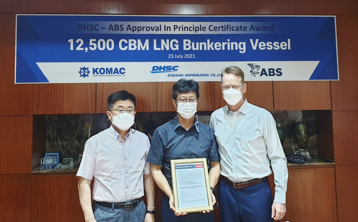 Daehan Shipbuilding ανακοίνωσε στις 23 ότι έλαβε έγκριση κατ' αρχήν (AIP) για τον βασικό σχεδιασμό του "125K LNG Bunkering Vessel (LBV) που προμηθεύει καύσιμο LNG σε σκάφη ανοικτής θαλάσσης, από το ABS στις ΗΠΑ, γνωστό ως η παγκόσμια κατάταξη τριών κορυφαίων κοινωνία. Η τελετή πιστοποίησης πραγματοποιήθηκε στο γραφείο της ABS Busan. Lee Kyung-Seok, επικεφαλής του τμήματος τεχνολογίας Daehan Shipbuilding's, Darren Reskowski, Διευθύνων Σύμβουλος Πωλήσεων Άπω Ανατολής Ασίας, Kim Sung-hoon, επικεφαλής του υποκαταστήματος ABS στην Κορέα και τον Kang Ο Young-Geun, εκτελεστικός διευθυντής της KOMAC (Korea Maritime Consultants) παρευρέθηκε στην τελετή. Η Daehan Shipbuilding και το ABS είναι από κοινού ανάπτυξη μικρού πλοίου LNG Bunker με την KOMAC. Η Daehan Shipbuilding εκτελεί τον βασικό σχεδιασμό των πλοίων, η ABS διενεργεί έλεγχο συμμόρφωσης με τους κανονισμούς, αναθεώρηση, αξιολόγηση κινδύνου , και επαλήθευση ασφάλειας και καταλληλότητας. Η Daehan Shipbuilding εξήγησε ότι αναμένει να αυξήσει την ανταγωνιστικότητά της στις πωλήσεις μέσω των εξελίξεων της ναυαρχίδας επόμενης γενιάς από την obtai ning AIP.